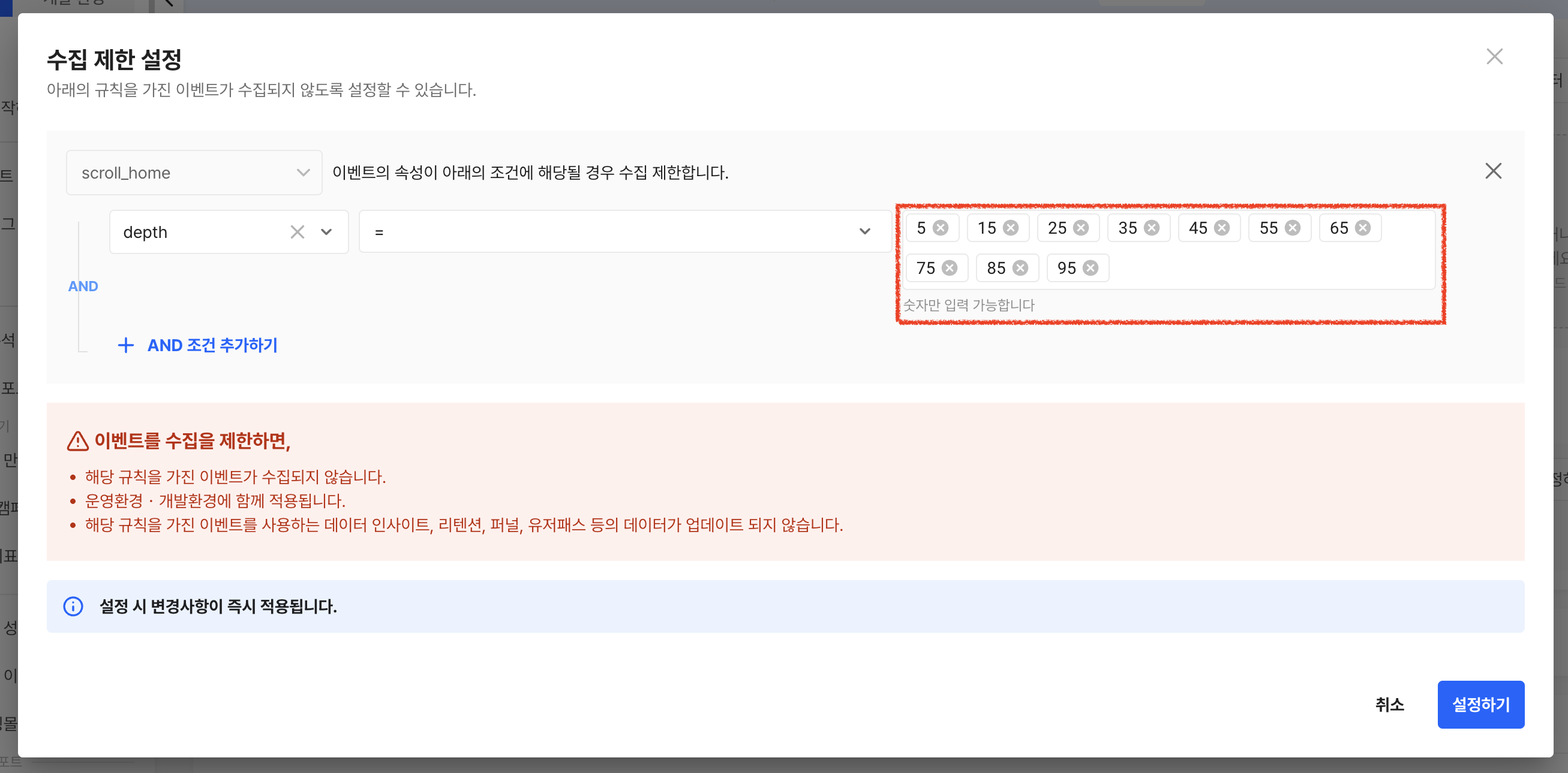 아래 화면은 특정 depth 값을 속성으로 전달하는 이벤트를 수집하지 않겠다라는 설정 화면입니다.