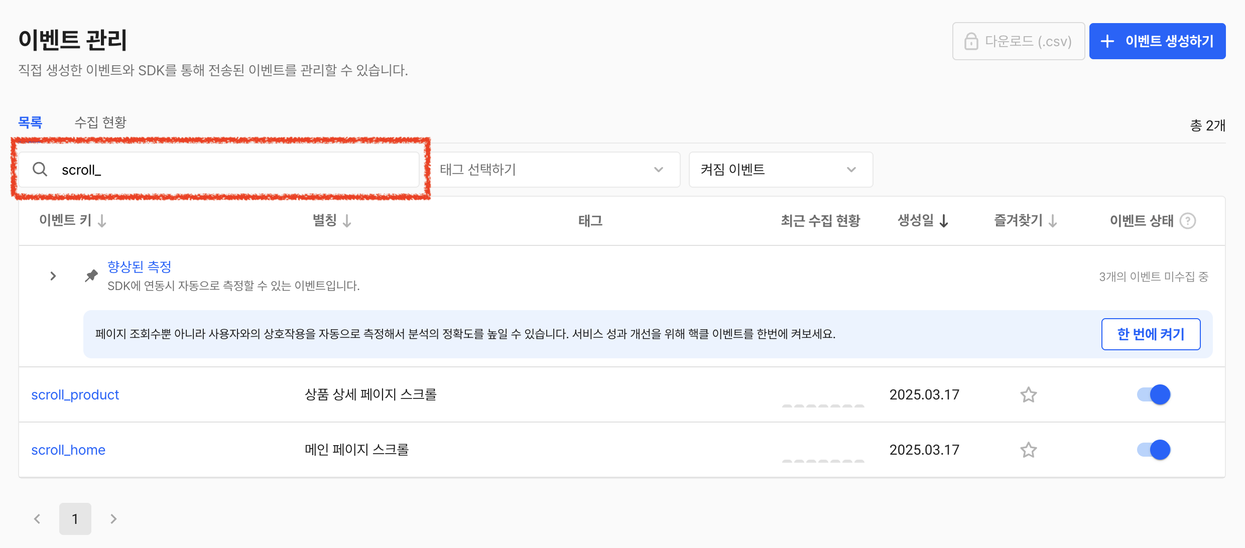 scroll_home 이벤트의 상세 페이지로 이동하면 아래와 같은 화면을 볼 수 있습니다.
