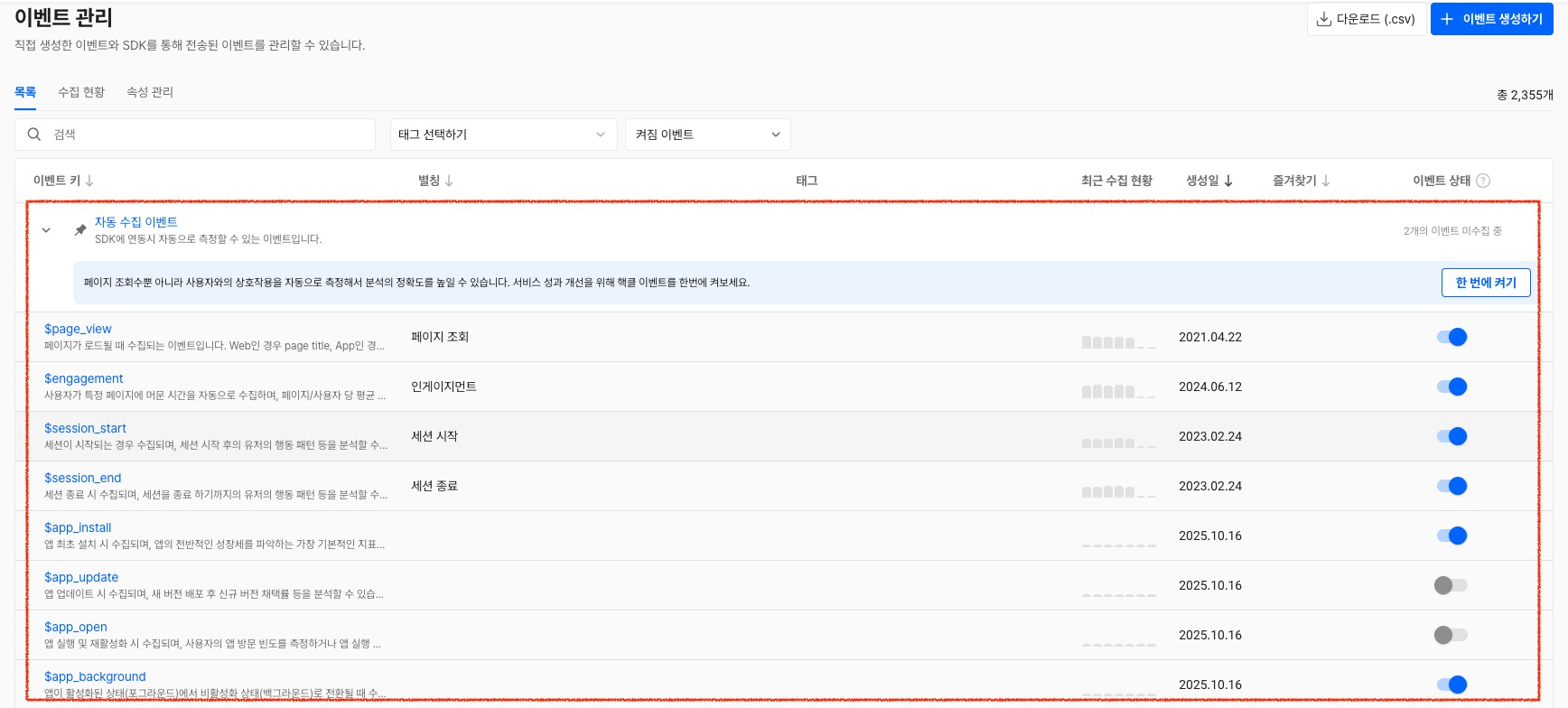 이벤트 관리의 [자동수집 이벤트] 영역에서 별도로 커스텀 이벤트 전송하지 않아도, 자동으로 수집할 수 있는 이벤트를 확인할 수 있습니다.