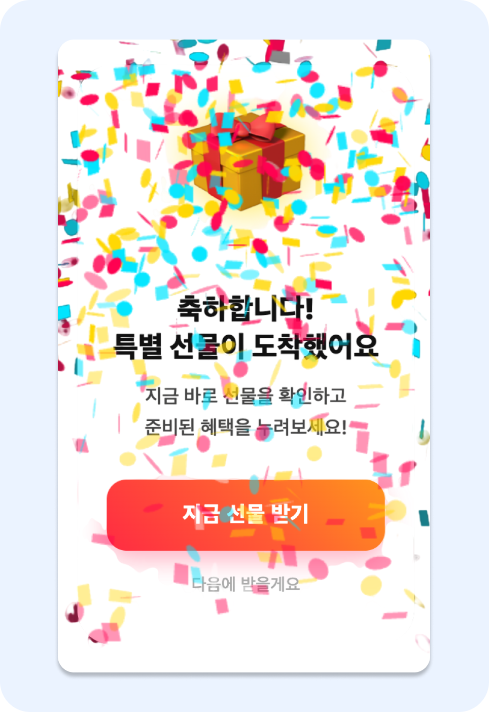 https://example.com/giftURL로 이동하며 **mega_gift_receive** 를 이벤트 속성으로 포함하는 인앱 메시지 전환 이벤트를 발생시킵니다. - "다음에 받을게요" 버튼을 클릭하는 경우 인앱 메시지가 닫힙니다.